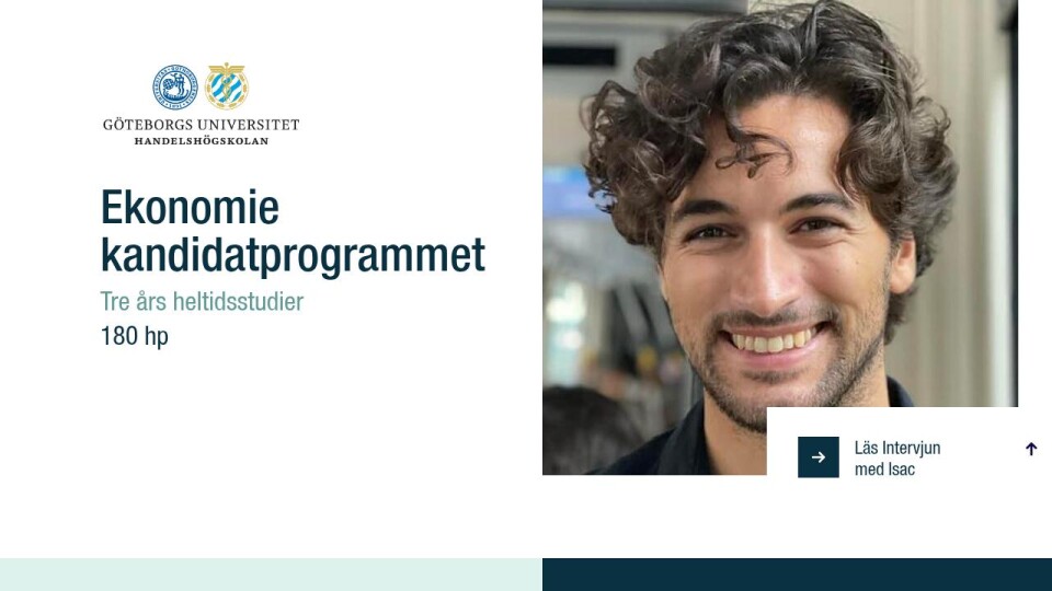 Kandidatprogrammet i ekonomi passar dig som är intresserad av ett framgångsrikt yrkesliv inom svenskt och internationellt näringsliv och förvaltning. Du läser kurser som ingår i klassiska ekonomutbildningar tillsammans med våra programspecifika kurser där du får öva på att praktiskt tillämpa dina kunskaper i företags- och nationalekonomi. I dessa kurser är hållbarhetsfrågor och etiska perspektiv viktiga inslag.