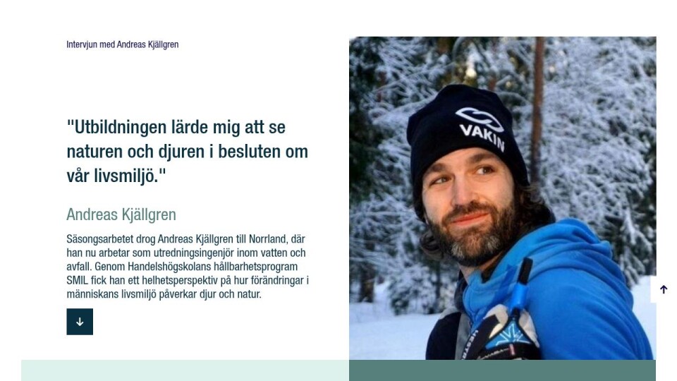 Säsongsarbetet drog Andreas Kjällgren till Norrland, där han nu arbetar som utredningsingenjör inom vatten och avfall. Genom Handelshögskolans hållbarhetsprogram SMIL fick han ett helhetsperspektiv på hur förändringar i människans livsmiljö påverkar djur och natur.