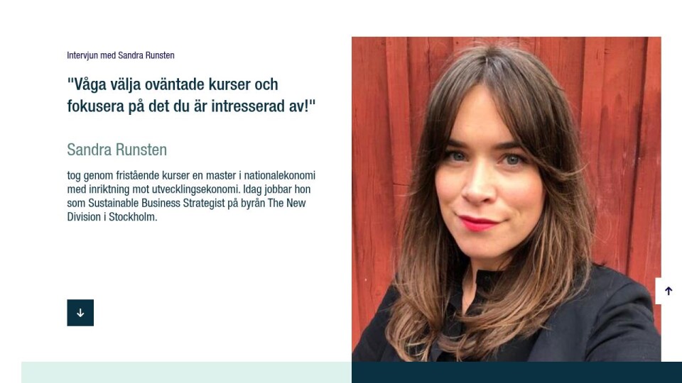 tog genom fristående kurser en master i nationalekonomi med inriktning mot utvecklingsekonomi. Idag jobbar hon som Sustainable Business Strategist på byrån The New Division i Stockholm.